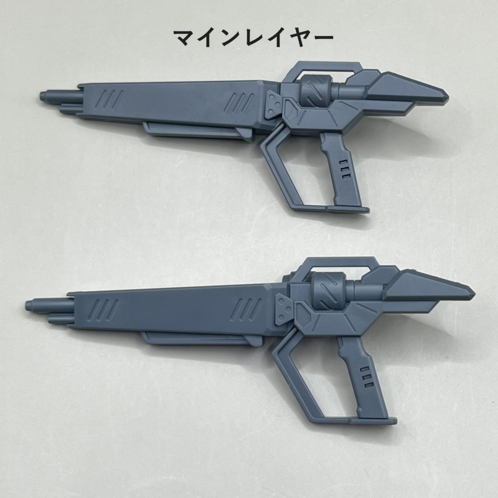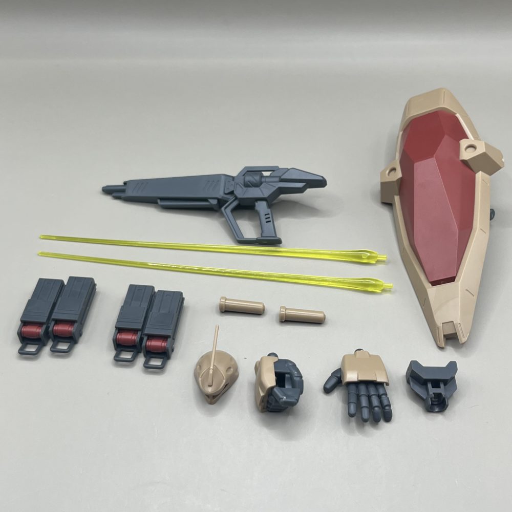 付属品はロング・ビーム・ライフル、ビーム・サーベル×2、シールド、マインレイヤー・ユニット×2、指揮官用頭部、銃持ち手(右)、平手(左)、アクションベース接続用パーツ。