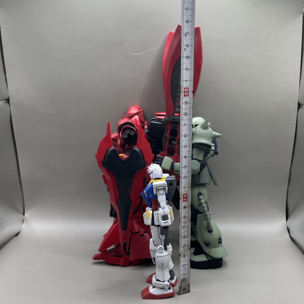 追記:HGガンダムオリジン版とMGザク2.0を並べて大きさ比較。サザビー本体は約18.5cm、ダブルホーンファンネル装備時は約27.0cmあります。